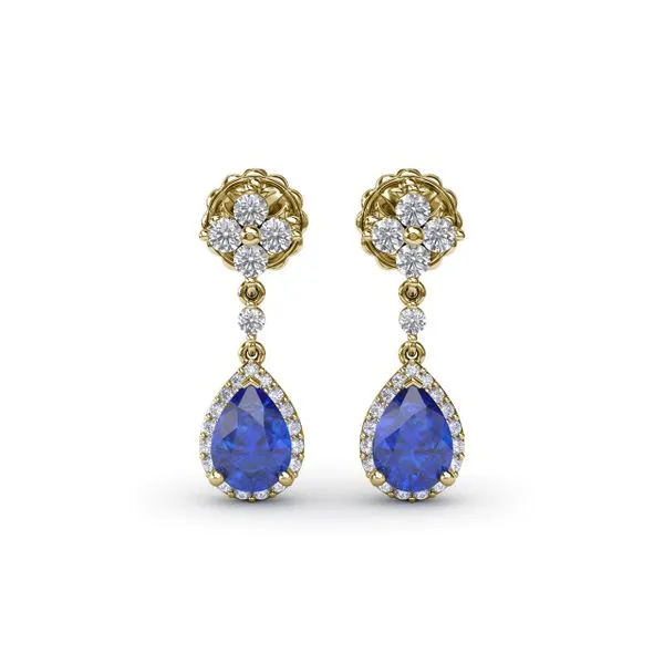 These sapphire and diamond teardrop dangle earrings are a symbol of sheer elegance. These earrings come in a variety of material types like 14k white gold, yellow gold, rose gold and can be customized. Classic Fana diamond earrings are perfect for that special woman in your life.